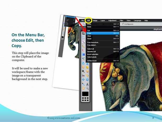 De la barra de menú elegir Editar otra vez. Esta vez seleccione copia porque vamos a copiar la imagen (elefante) en un lienzo en blanco - sin fondo.