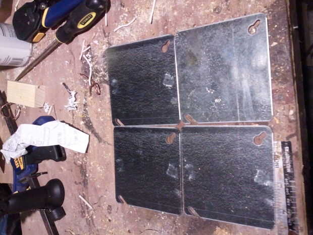 Haga 4 agujeros en cada tapa con el 3/16" bits, aproximadamente la misma distancia aparte, en algún lugar cerca de la mitad. Si se mide en cerca de 1.5" de las esquinas del metal, es lo suficientemente bueno. Si tienes un taladro lo suficientemente valiente, debe ser capaz de perforar a través de todas las piezas a la vez para 4 sesiones total. Si no, usted puede hacerlos por separado, hacer seguro que los orificios que son perforación coinciden exactamente con los demás de pieza a pieza.