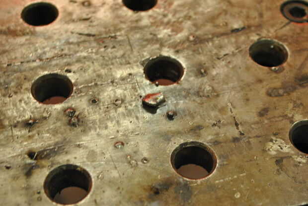 Ahora puede utilizar la amoladora angular para hojear ligeramente la superficie. Asegúrese de mantener el molino en movimiento y no cavar demasiado profundamente en la mesa. Tener rápidamente una idea de cuánto presión es necesaria quitar salpicaduras, pero no echar a perder la tabla.