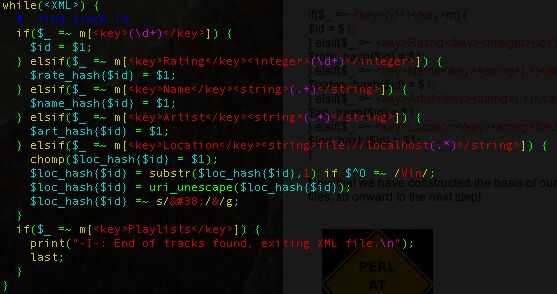 if($_ =~ m[<key>(\d+)</key>]) { $id = $1; } elsif($_ =~ m[<key>Rating</key><integer>(\d+)</integer>]) { $rate_hash{$id} = $1; } elsif($_ =~ m[<key>Name</key><string>(.+)</string>]) { $name_hash{$id} = $1; } elsif($_ =~ m[<key>Artist</key><string>(.+)</string>]) { $art_hash{$id} = $1; } elsif($_ =~ m[<key>Location</key><string>file://localhost(.*)</string>]) { $loc_hash{$id} = $1; } Ahora que hemos construido la base de nuestra base de datos hash, cubrimos localizar y eliminar los archivos de 1 estrella, así que adelante con el siguiente paso!