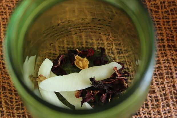 No necesita mucho de las hierbas, frutas o bolsitas de té para un 8oz tarro de masón. Un poco va un largo camino en el proceso de infusión.
