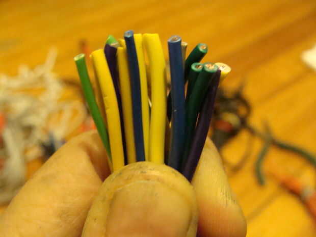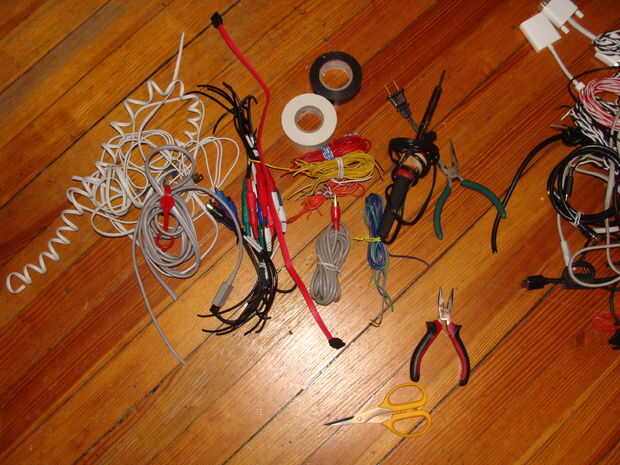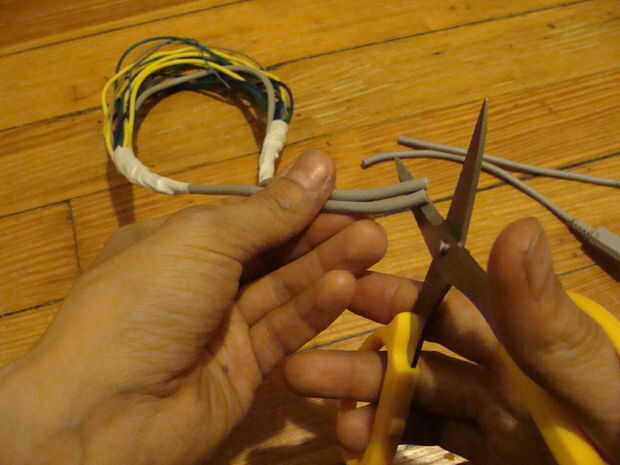 El primer paso consiste en seleccionar cables de colores llamativos nos gusten. El diametro de estos no cables es muy grande, yo al menos utilicé cables reciclados de Soundtrack de máximo 3mm (1/8 pulg) de diámetro y el largo de ellos es aproximadamente 20cm (8 pulgadas).