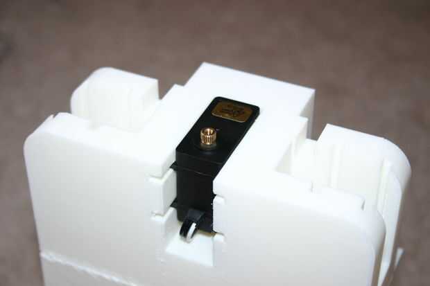 Inserte el cable de servo de cuello a través del orificio en la parte posterior de la parte superior del torso. Coloque el motor en la ranura del centro, del eje hacia la parte delantera.