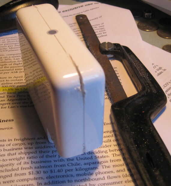 Uso la mano una sierra y corte a lo largo de la costura de caso de la Airport Express. La costura es donde las dos piezas de la caja se unieron. La profundidad que necesita a la Sierra es 1/8 de pulgada. Debe parar cuando el plástico se rompe a través y usted puede ver el interior. Ir poco a poco que no quieras dañar nada dentro.