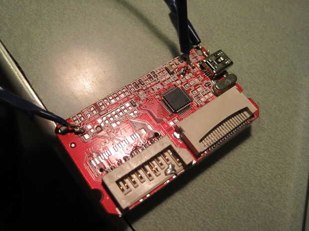 Soldar el cable de tierra a la tierra en el lector de tarjetas de memoria CF. Soldar el cable de 5v en el punto de 5v en el lector de tarjetas de memoria CF. Alambre de soldadura los 3.3v a los 3, 3V en el lector de tarjetas de memoria CF. Puede probar el lector de tarjetas CF para ver si los cables están llevando energía.