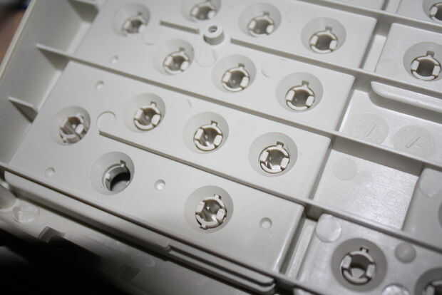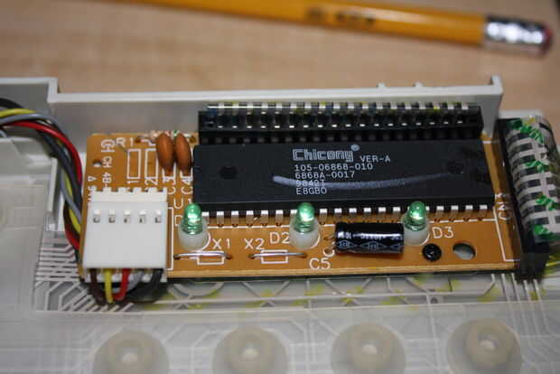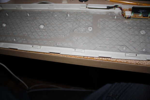 Una nota rápida sobre el funcionamiento de un teclado. La alfombra se sienta encima de la lámina de mylar, realmente 3 hojas. 2 en contacto con hojas y una hoja de separador. Las hojas de mylar tienen rastros de plata en ellos y cuando los rastros entran en contacto con uno otro completan un circuito (una tecla). Así que la clave empuja hacia abajo el eje, que deprime el "pezón" en la estera sobre el mylar, que crea un contacto en el rastro específico para esa clave. Mi sugerencia es retirar la cubierta superior de plástico con las teclas y solo dejar la parte inferior, la estera, el mylar y el controlador solo al lado de la mayor parte de su proyecto sólo jugar con ella a lo mejor pone la parte superior en cuando tienes las llaves para asegurarse de que funcionan.
