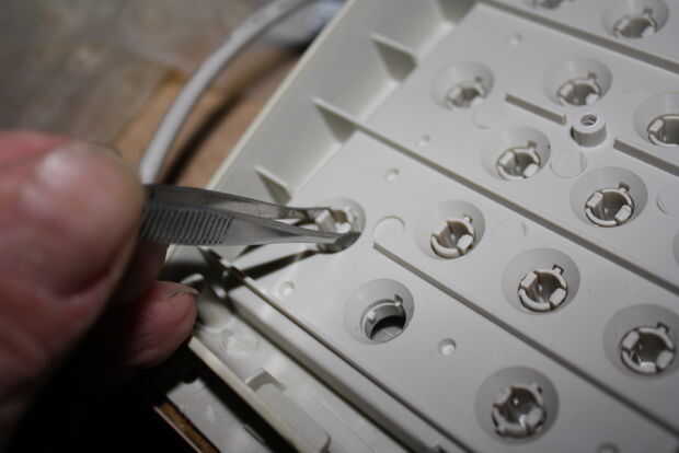 Una vez tienes el teclado separado y tiene su superior Retire las llaves. La mejor manera de hacerlo es utilizar un par de pinzas como se muestra arriba. Al final tomé mis llaves y apagar muchas veces y he utilizado unos alicates desde la parte superior generalmente pero sugiero evitar ese método hasta que sea necesario que no desee hacer un estrechamiento de los pequeños corredores en los ejes. Guardan las llaves alineadas para que no gire y para que deslice verticalmente. Si aplastar o abollarles pueden causar las teclas para pegar y una reparación es poco probable que funcione tan bien en las palabras del público en General "ternura un poco".