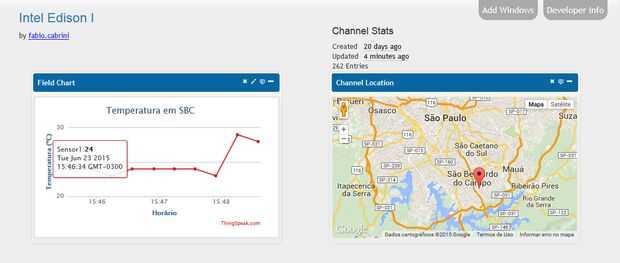 Nota: Você deve inserir corretamente un chave de escrita e número canal ningún código antes de compilá-lo. Para cada Intel Edison, será necessário criar um novo no canal ThingSpeak.
