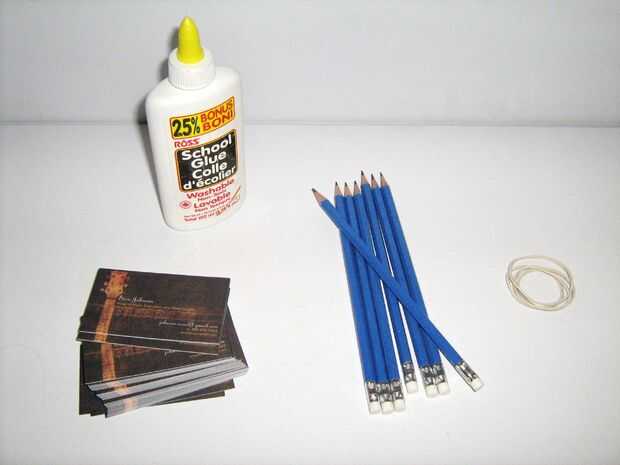 Desea tomar aproximadamente 50 tarjetas a la vez - si vas alto como hasta 100 se pone débil, y si vas como unos 25 no es tan impresionante. Vas a querer lápices o bolígrafos, algo que tiene una cara plana en la funciona mejor que un cilindro redondo porque no abolla las tarjetas tanto cuando sujetarlos. Usted también querrá algunos elásticos (yo usé dos los realmente grandes). Y por supuesto querrá a algún tipo de pegamento cola - blanca o pegamento de carpintero trabajo funciona mejor.