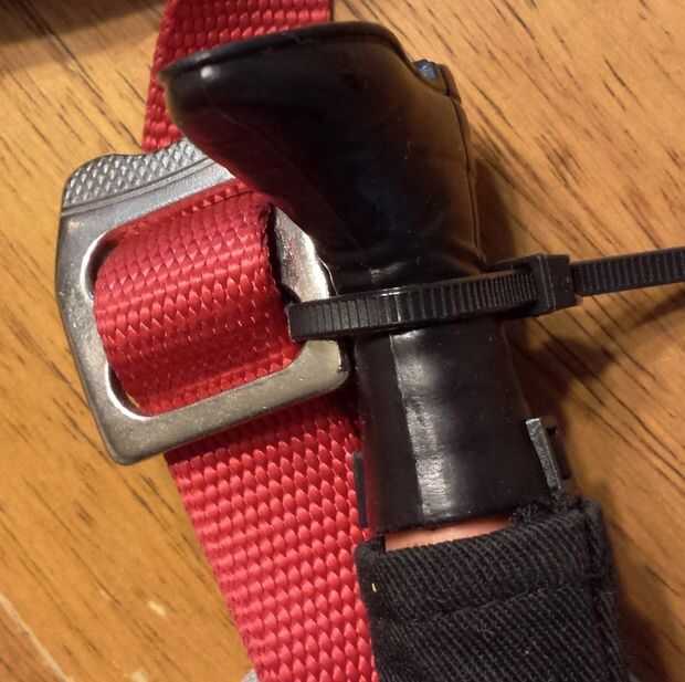 Corrí una amarra alrededor de la cintura de Ken y a través del lazo en la parte superior del arnés del perro. Este cinturón negro plástico actuó como un cinturón para Ken, sosteniendo su cuerpo en su lugar.