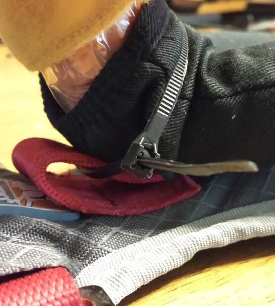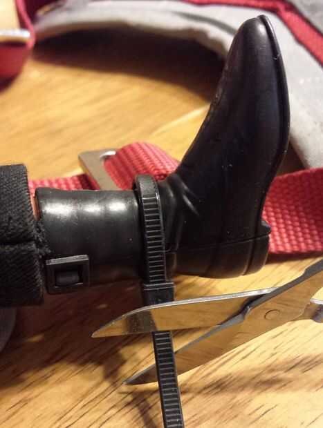 Quería que los muñecos a estar firmemente sujetas a los arneses. Sujeción en los tobillos afianzaría las piernas como estribos, mientras que el cinturón de seguridad mantendría a sus colillas en las silletas. Empecé con la muñeca de Ken y se burló de su posición con el arnés en un perro. Los pies colgaron al lado de las hebillas hacia adelantadas, que harían un accesorio sólido punto. He utilizado mis sujetadores preferidos, zip lazos (también conocidos como abrazaderas de cable). Los negros pequeños mimetizarse con las botas negras. Que había atado de los tobillos hacia fuera de las hebillas y girar los extremos en la espalda donde ellos no se verían tan fácilmente. Recortan el exceso de la amarra con tijeras.