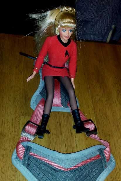 Traté de Barbie de Monte en el otro arnés con la misma disposición, pero que tenía que mover los tobillos de Barbie en el interior de las hebillas. Hay, uh, no forma educada de decir esto, pero no separó las piernas de Barbie.