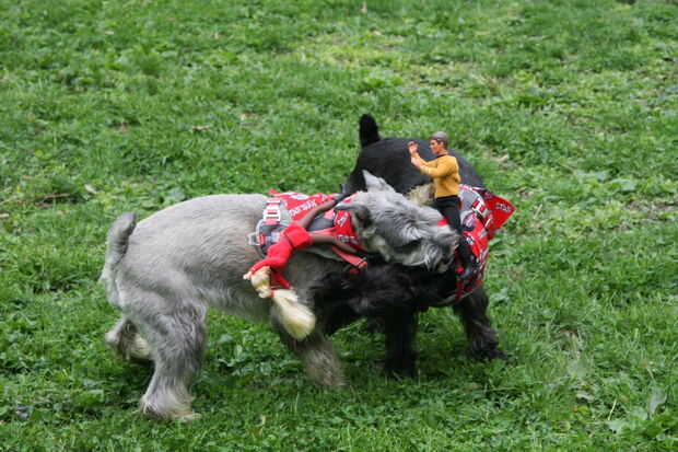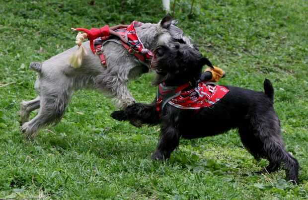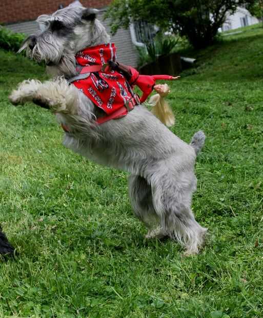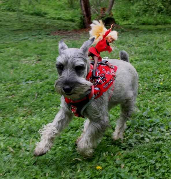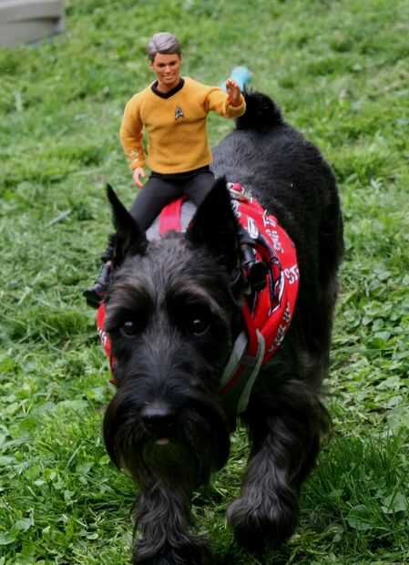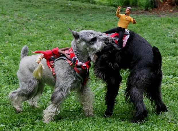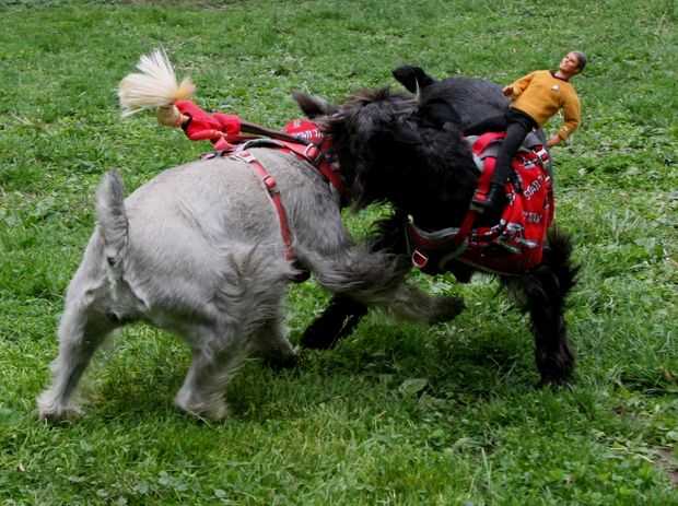 Tomé los pañuelos y les ató alrededor del cuello de los perros para que el material cuelga sobre la espalda como una capa. Parecían un poco mantas de caballo, que apoyó la ilusión de montar a caballo. Quité los collares que llevan normalmente porque no eran necesarios y no coincide con el esquema de color. Luego amarró los arneses a Isabel y añil y dejarlos fuera de control. Las muñecas soportó bastante bien, pero de vez en cuando tuvo que ser ajustado en su posición. Significativamente, nunca cayeron, a pesar de ser puesto a una prueba severa. Como se puede ver, los perros estaban jugando duros. Aunque originalmente quería un tema vaquero, me encantan los uniformes de Star Trek. Sólo podría ser mejores si Ken llevaba una camisa roja!