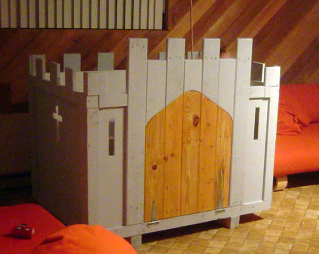 Cortar el puente levadizo y flecha ranuras con una sierra de calar y reciclar una gran plataforma para las tablas que forman las almenas y torre delantera. Utilicé una sierra de mano para recortar las mejores tablas para acomodar la torre y almenas. Tenga en cuenta que el puente levadizo no puede ser retirado en el castillo porque las juntas se cortan más grandes todo alrededor de la madera contrachapada (ver segunda foto para detalle). Todo se sostiene junto con tornillos para madera (perforado y avellanado del interior) y adhesivo para construcción. Utilizamos un sobrante de la alfombra para cubrir el piso. Hemos añadido un puente levadizo de la tela tire (ver tercera foto) para que los niños podrían cerrar el puente levadizo desde dentro.
