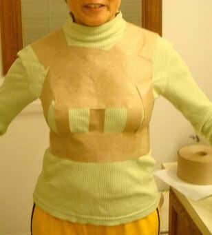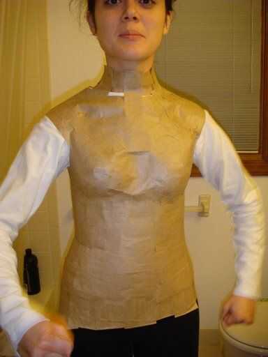 A continuación la cinta del pecho y hombros, como hacer un arnés. Las piezas pequeñas en diferentes direcciones sobre piezas con curvas y tratar de mantenerlos acostado contra el cuerpo. Si encuentras un pliegue o arruga en la cinta, usted puede de la muesca para mantenerlo acostado.