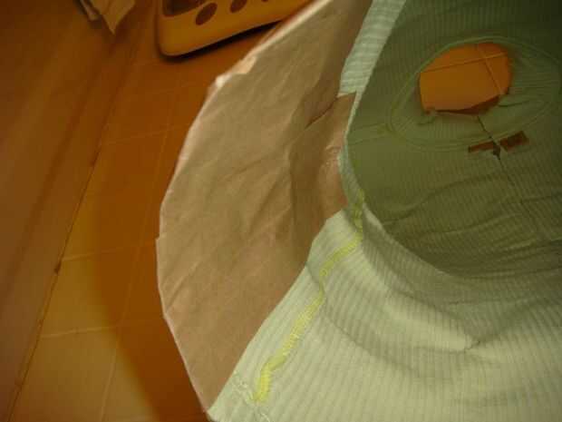 Después de la línea de fractura es sellada, terminar los bordes inferior y el cuello doblando tiras de cinta adhesiva sobre desde el exterior al interior. Puede recortar las mangas y hacer lo mismo que, o nudo les y empujar dentro de la forma.