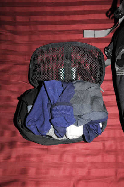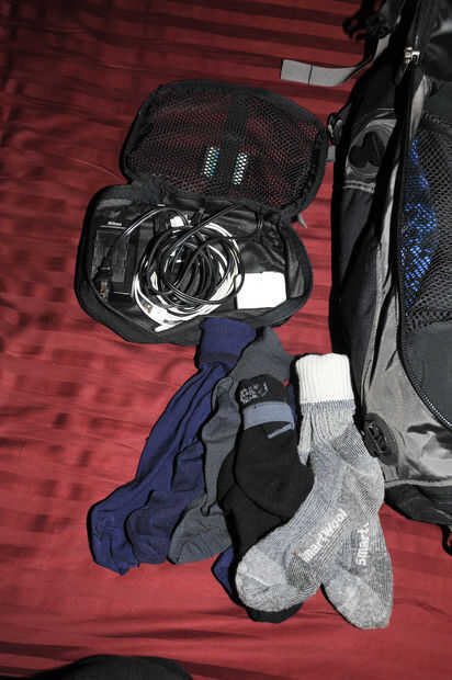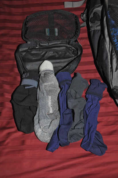Una de las cosas más importantes que el paquete es calcetines. Hacen una gran diferencia en lo cómodo es. Me gusta usar calcetines bastante gruesos con trazadores de líneas del calcetín (básicamente finos calcetines) en su interior. Puede sonar como overkill a llevar calcetines de doble, pero no me gusta calcetines delgados cuando estoy haciendo un montón de caminar, y los trazadores de líneas del calcetín respiran bien. En tiempo muy caliente, puede usar sólo los trazadores de líneas del calcetín. Los trazadores de líneas del calcetín se seca rápidamente, por lo que se consigue lavar todos los días, pero no los calcetines gruesos. Como la ropa interior, que desea mantener sus trazadores de líneas del calcetín muy limpias.