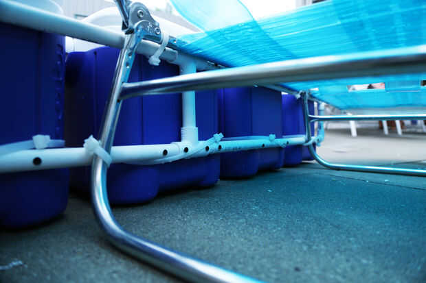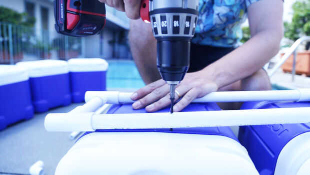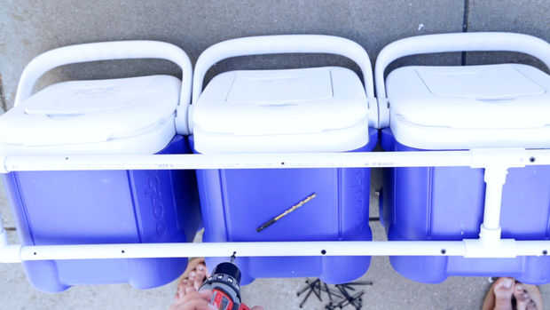 Cuando se perforan los orificios piloto, atornille los rieles en los refrigeradores para que queden bien alineados y coherentes. También es una buena idea añadir tornillos a través de las conexiones t en la mitad inferior de los carriles un poco seguro contra los tubos tirando bajo el peso.