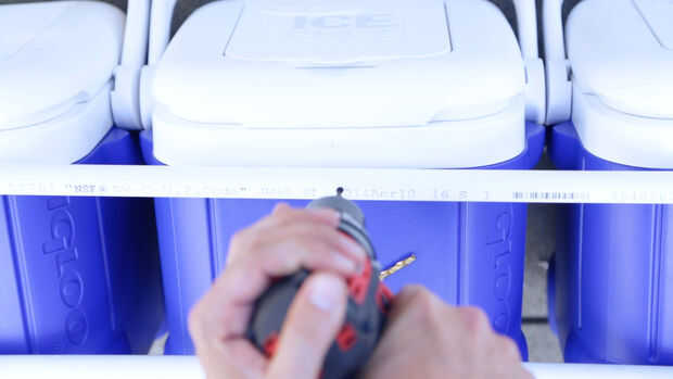 Colocar 4 refrigeradores en una fila con la tapa hacia usted. Luego coloque el riel lateral contra los refrigeradores alineados como se muestra. Esto le dará una guía para perforar los agujeros pilotos.