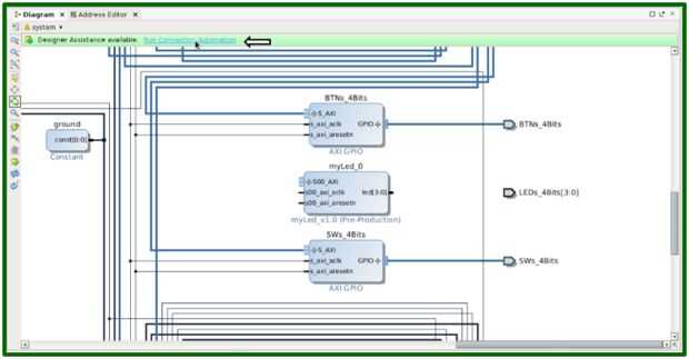 El bus myLed Core IP AXI4-Lite debe conectarse al sistema de procesamiento. En la parte superior de la ventana, haga clic en el texto azul que dice ejecutar conexión automatización. Esto conectará a las entradas de la base del IP myLed. Usted debe ver que S_AXI ahora está conectado a la salida del primer de la interconexión de AXI.