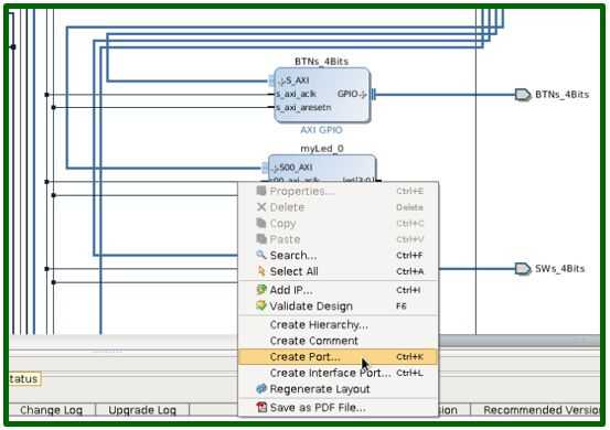 A continuación tenemos que conectar la IP myLed a un puerto externo. El núcleo IP myLed que implementamos no se conectará a la LEDs_4Bits existente puerto así que tenemos que hacer un nuevo puerto externo llamado led. Haga clic en existente LED puerto y pulse delete. Para crear el puerto nuevo haga clic derecho y seleccionar crea puerto. Nombre del puerto, seleccione el vector de salida, seleccione [3:0] y pulse enter.