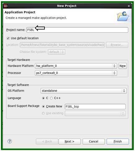 Se nombre el proyecto FSBL. Seleccione hw_platform_0 para Hardware de destino porque es el proyecto de hardware que sólo exportamos. Seleccione independiente para la plataforma de sistema operativo. Haga clic en siguiente.