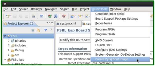 Ahora, tenemos todos los archivos listos para crear el arranque. BIN. Haga clic en herramientas de Xilinx -> crear imagen de arranque de Zynq.