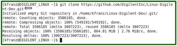 El comando git: Si tienes git instalado en su distribución, puede clonar el repositorio a su ordenador por comando git clone https://github.com/DigilentInc/Linux-Digilent-Dev... El repositorio de Git todo es alrededor de 850MB, como se muestra en la imagen 1.