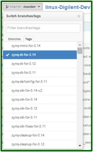 Descargar un paquete comprimido: Si sólo desea utilizar u-boot de una vez y no quieren seguir las actualizaciones, también puede descargar un paquete comprimido de github.com: https://github.com/DigilentInc/Linux-Digilent-Dev. Haga clic en etiquetas en la parte superior derecha de la página. La etiqueta más reciente es zynq-dt-para-3.14 (imagen 2).