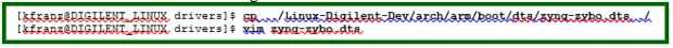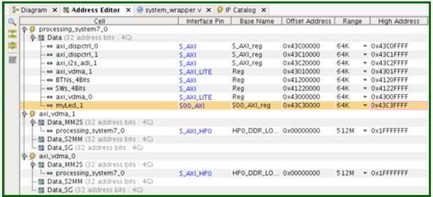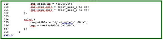 Hacer una copia de la fuente de árbol de dispositivo predeterminado en la carpeta de drivers y modificarla según la segunda imagen. La cadena de la compatibilidad del nodo es el mismo que definimos en el código fuente del controlador (myled.c: línea 182). La propiedad reg define la dirección física y el tamaño del nodo. La dirección aquí debe coincidir con la dirección de la base de myLed IP en la ficha editor de dirección del diseño Vivado, como se muestra en la última imagen.