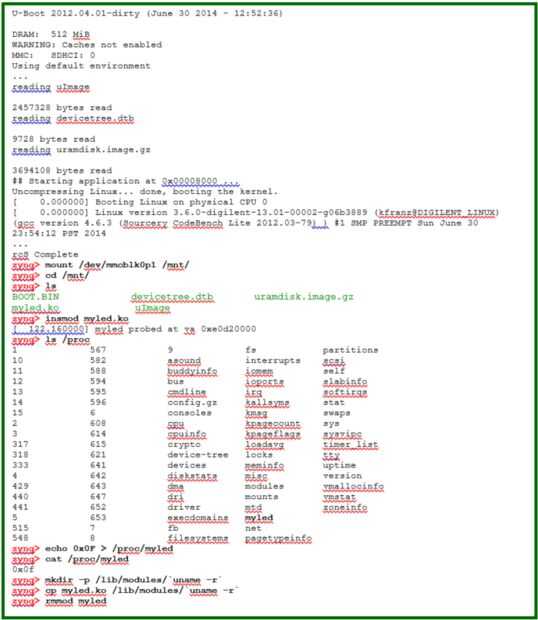 Conecte la tarjeta SD en el Zybo, y podemos empezar a probar nuestro conductor. Utilice el comando insmod para instalar el módulo en el kernel. Después de instala el driver, se crea una entrada llamada myled bajo el sistema de archivos /proc. Escritura 0x0F para/proc/myled se ilumina LED 0 ~ 3. O bien puede eliminar el driver con el comando rmmod o apagado el sistema de comando poweroff. En ambos casos, todos los LEDs se apagarán, como se muestra en la figura 69 y 70. Para obtener instrucciones sobre el uso de la terminal con el Zybo. por favor consulte el paso V-4 o inicio de la sección de SD en primeros pasos con Linux embebido-ZedBoard.