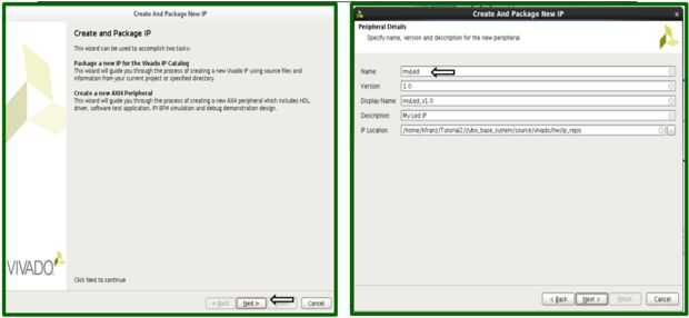 Ahora podemos comenzar a implementar nuestra myLed Core IP. Haga clic en herramientas -> crear y paquete IP... desde el menú (imagen 1). La creación y nueva de paquete IP aparecerá ventana (imagen 2), haga clic en siguiente. En la siguiente ventana el nombre la nueva IP y haga clic en siguiente otra vez (imagen 3).