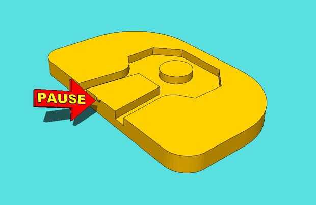Ahora, mire de cerca la impresión comienza a tomar forma. Preste especial atención a la zona entre las aperturas para los cables de la pinza. En un poco, se dará cuenta de que la extrusora comenzará a hacer una pequeña protuberancia en la cara de la construcción, exactamente a medio camino entre las aberturas. Ahora espere a que la extrusora construye una capa sin hacer el golpe. Cuando la cabeza de la impresora se mueve a la parte posterior de la impresión, presione el botón de "Pausa" de la impresora.