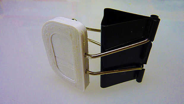 CUIDADOSAMENTE coloque el cable de su clip en la parte ahuecada hacia fuera de la impresión. Si no encaja el alambre, alicate su doble y coaxial en forma para que encaje.