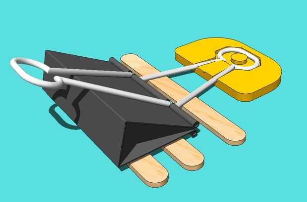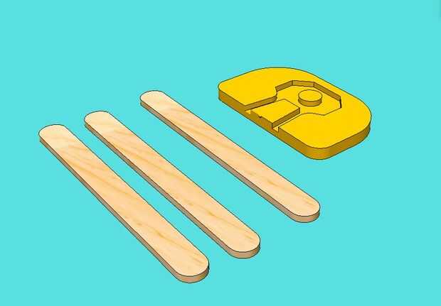 Después de que la impresora comienza a hacer el contorno del acero de la abrazadera de cables en el centro de la pieza, conjunto de 3 o 4 de sus palitos de frente a la construcción como se muestra. NO establece los palillos hacia fuera temprano. Hasta que la pieza es más alta que el grueso de los palillos del popsicle, sus extrusoras pueden ejecutar en ellos, arrastre, romper su impresión y en general, arruinar su día.