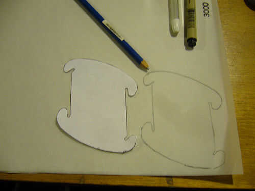 3. trazarlo 12 veces en una hoja resistente Rolux. Para el rastro 12 utiliza el patrón con un agujero en el centro.
