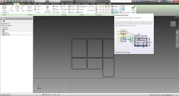Queremos primero crear una nueva parte y comenzar un dibujo. Una vez en el bosquejo, puede seleccionar el botón ACAD que se muestra en la imagen de arriba para insertar el DXF desde el último paso.