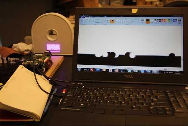 La imagen en la pantalla del ordenador es de un segmento con una impresión que tiene elipses con diámetros de 4px conectados directamente al proyector de TI que vive dentro de la impresora de Ember. Te darás cuenta que las elipses no son alisadas o suavizado. Tratar de diferentes estampados y tamaños de pixel, parece que alias archivos mejor impresión.