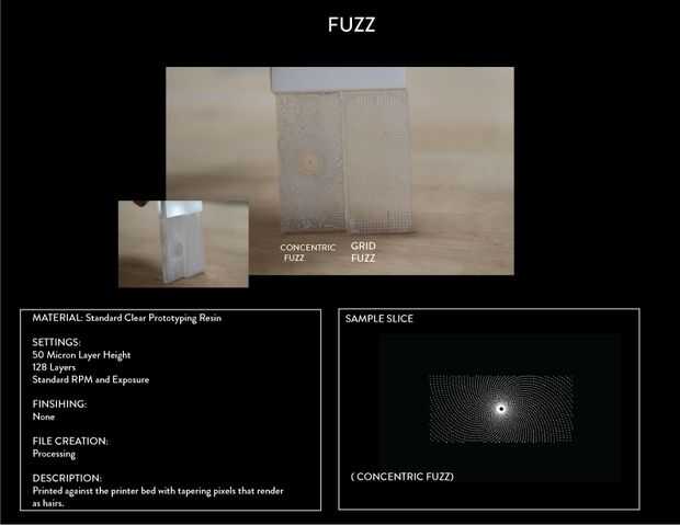 La brasa impresora imprime con resolución de 10 micrones. Un cabello humano es aproximadamente de 40-50 micras y un pixel impresiones para ser cerca de 50 micrones. Esto significa que impresión superficies difusas y pilosas son absolutamente posibles. Cada una de estas impresiones difusas, filamentos individuales cónicos de 8px amplia en la base a 4px amplia cerca de la punta. La pelusa concéntrica impresión tiene pelos circular mientras que la pelusa de la rejilla tiene pelos cuadrados.