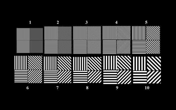 La imagen del patrón de prueba creada en Microsoft Paint y guardada como un PNG. En este caso las etiquetas numéricas sólo dan el ancho y la separación, en píxeles, de las líneas en cada juego. (Para las líneas a 45°, las anchuras y las separaciones son sólo aproximadas.)