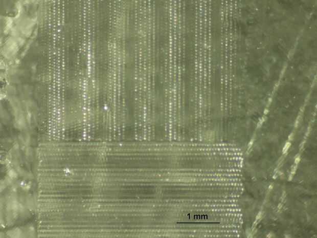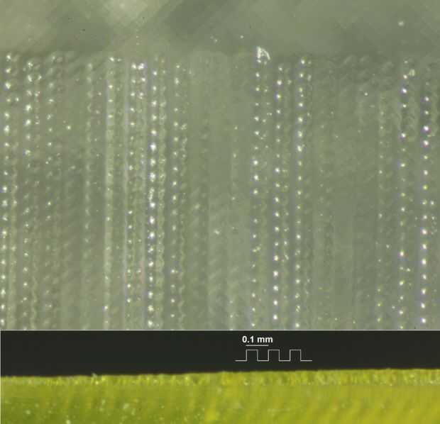 Los píxeles de diamante son claramente visibles en la segunda imagen más ampliada arriba, en el que las "perlas" brillantes parecen ser los más altos y cada uno corresponde a un píxel único diamante. Otra copia de la impresión (más amarillento porque era post curado por un tiempo más largo) se anotó en su parte posterior y desprendió perpendicular a las líneas verticales. La vista de su borde muestra poca o ninguna variación de altura (aunque también es posible que la fractura fue alrededor en lugar de a través del individuales "perlas"). La escala muestra cómo ideal píxel líneas habría aparecido en sección transversal. Sin embargo, la altura vertical de las líneas fue comprimida, por razones que se discutieron en el paso 5.
