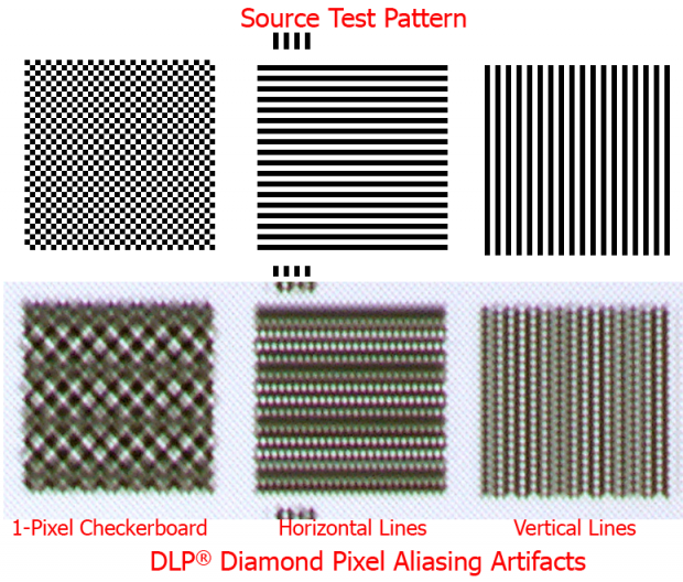 citado anteriormente. Las imágenes proyectadas de las líneas ancho de 1 píxel en sus patrones de prueba muestran que el mismo beat patrones. Son artefactos de aliasing de la filtración y remuestreo utiliza para traducir los píxeles cuadrados en la imagen de entrada a los píxeles del diamante en el proyector.