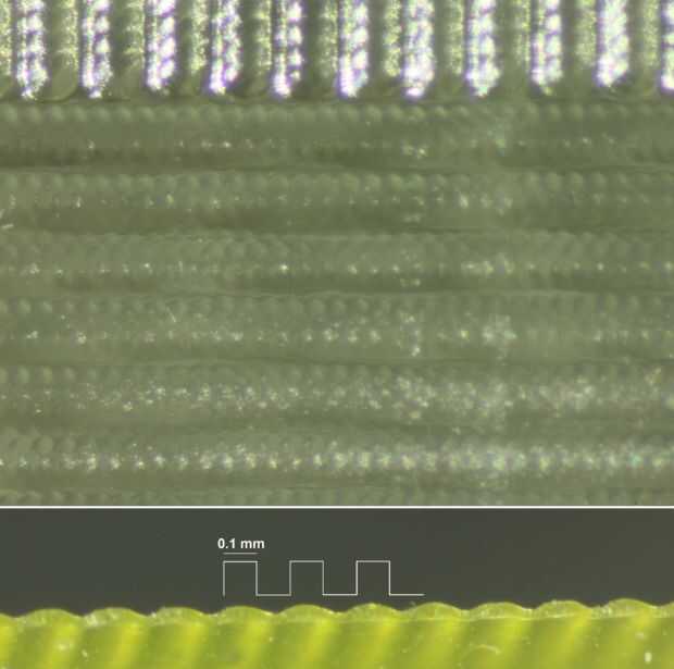 Aunque la altura de cada línea con respecto a los valles es mucho menor que el ideal que se muestra en la escala, distintas líneas son en efecto visibles, lo que indica una resolución de al menos 0,1 mm o 5 lp/mm. Ver el siguiente paso para obtener una explicación para las alturas bajas.