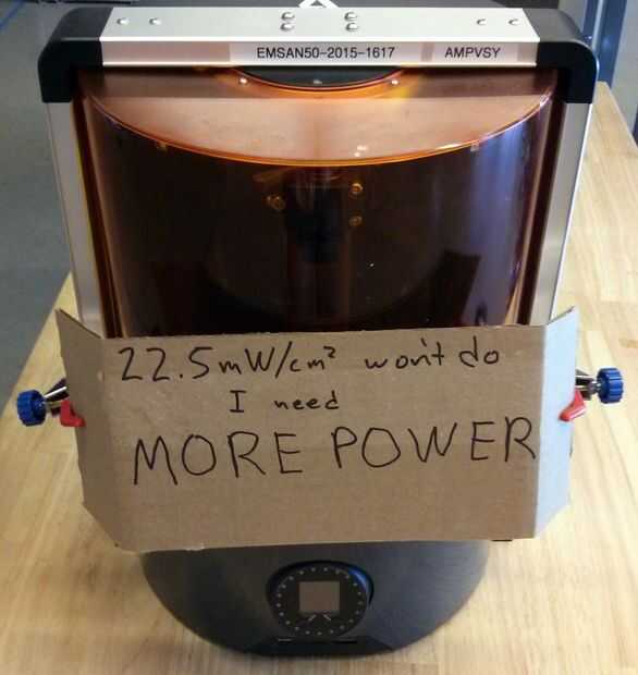 La máxima potencia de luz del proyector de Wintech utilizado en la impresora de Ember varía de unidad a unidad. En la fábrica el proyector en una impresora de Ember se ajusta para que todos los proyectores tienen la misma salida (aproximadamente 22,5 mW/cm2). Esto permite que la misma configuración de impresora ser utilizado en todas las impresoras de la brasa. Como consecuencia la mayoría de las impresoras pueden ser "overclockeadas" ajustando las configuraciones del proyector para obtener más potencia fuera del proyector.