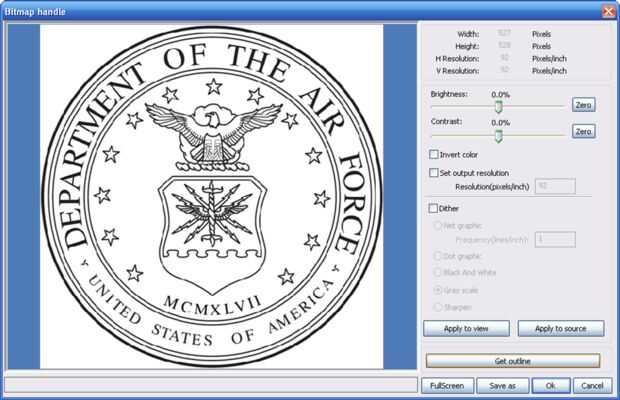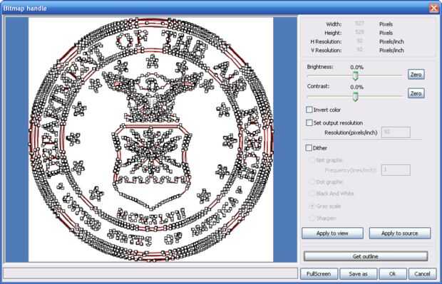 Una vez que la ventana está abierta para "mapa de bits mango" establece la resolución en donde quiero (1000 dpi) Esto permite una línea aguda con pequeños bordes rectos de las curvas. A continuación hacer clic en la opción "Obtener esquema". Después de un segundo el esquema entonces es overlaid en el gráfico original, haga clic en Aceptar para cerrar la ventana y llevarme de nuevo a la pantalla principal donde puedo editar y corregir cualquier imperfección en el rastro de software de la gráfica. Normalmente dedico un par de horas fijar líneas y enderezar la línea para permitir una imagen perfecta.