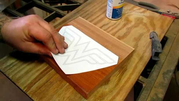 El patrón fue creado en Inkscape utilizando la herramienta Bézier para rastrear el emblema original de la mujer de la maravilla. Esto me dejó con un bonito dibujo del emblema. Pegué el patrón a la pieza de la cereza con un pegamento temporal spray.