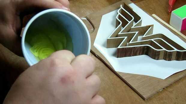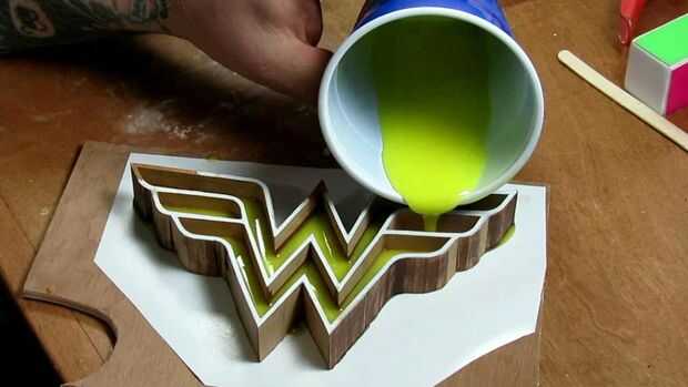 Se utilizó una resina epoxi de dos partes, como hacemos a menudo, para el vertido. Una vez más, se trata de Famowood esmalte capa, una tabla de la barra superior capa resina que funciona bien para muchas otras cosas. Lo utilizamos a menudo para el casting y para rellenar cavidades como lo hicimos en este caso. En cuanto a mezcla va, sólo tienes que seguir las instrucciones que acompañan la resina que usted elija. También hemos añadido un poco de pintura acrílica amarillo a la mezcla así.