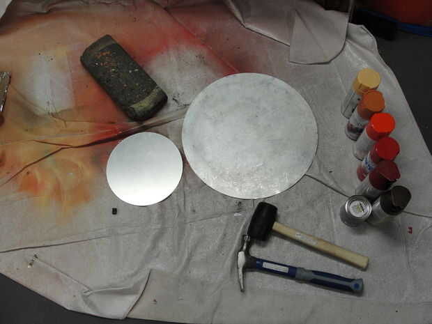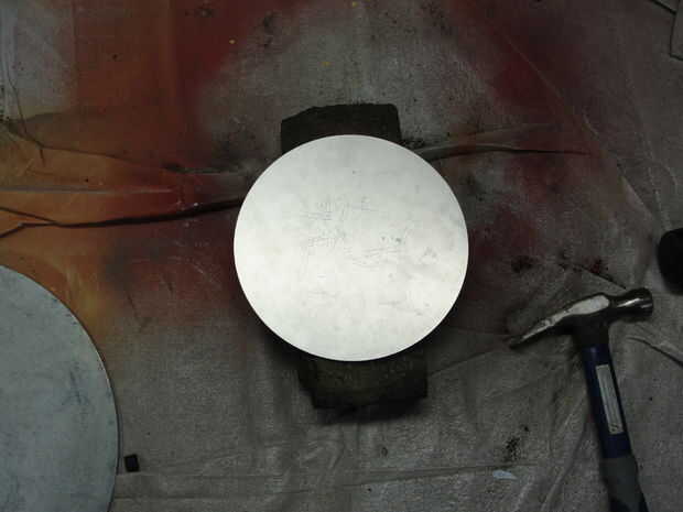 He encontrado que utilizando diversos martillos de metal era bueno para conseguir los diferentes abolladuras y golpes. El mazo fue bueno para la remodelación, como martilleo sobre una superficie elevada tienden a deformar los discos. Al final terminé con 2 discos ligeramente en forma de cuenco con fuertes marcas en 1 lado.