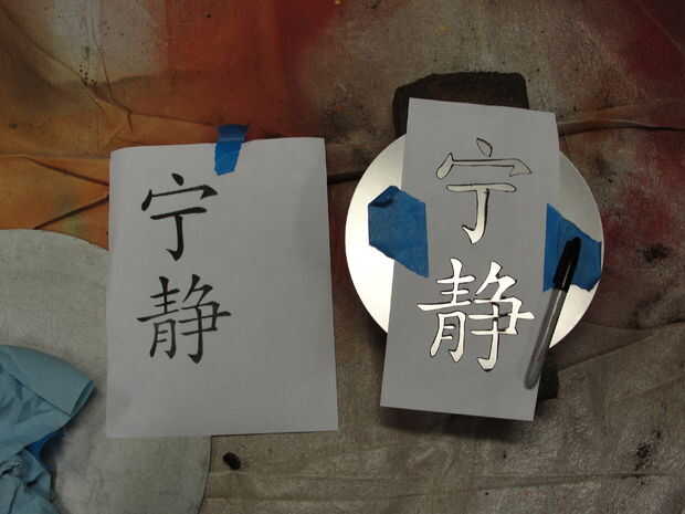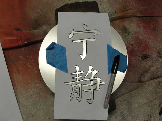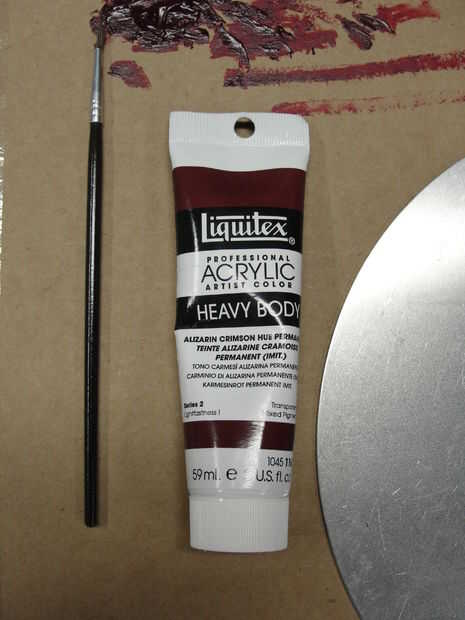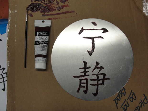 Ahora es el momento para pintar el medallón en blanco.  Me hizo saltar una imagen de los personajes que representa serenidad y había cortado con una navaja de afeitar.  Luego lo diseñará en mi disco más pequeño pintado (visto aquí de práctica).  Utilicé una pintura acrílica pesado rojo oscuro de la tienda de artesanía de Michael.  Utilicé un pincel fino muy pequeño que realmente de corte hacia abajo para hacer más fina.  Fui pesado con la pintura y utilizar el cepillo para empujarlo a donde yo quería.  Estoy por no estirar un artista (probablemente la primera vez he tocado un pincel real desde la escuela primaria!), por lo tanto el disco de práctica.