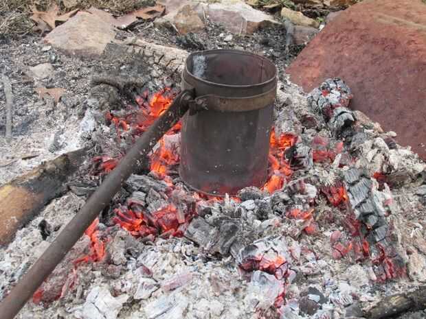 Ahora, encontrar algunos trozos de metal del pote, del cinc, lata o cualquier metal con bajo punto de fusión. Encontrar un poco más de lo que crees que te necesita porque cuando derrito habrá escoria. Fundirlo en lata a fuego como en la foto.